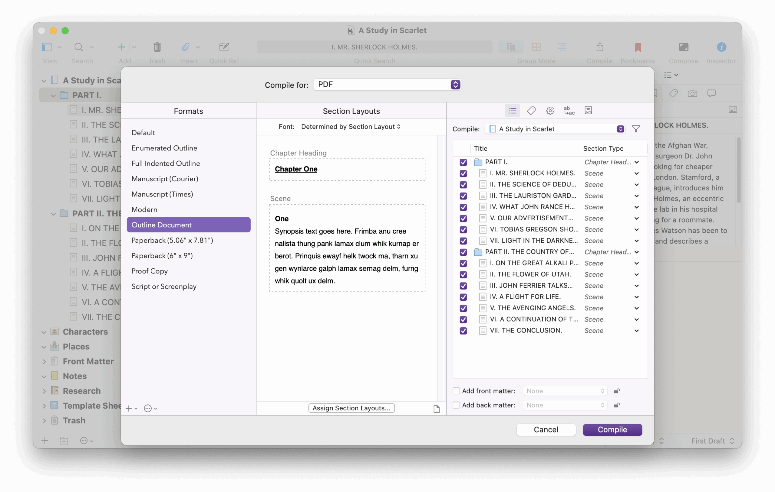 7. Compile and export a synopsis outline. Scrivener’s Compile feature puts all the elements of your project together to create a PDF or ebook, but you can also export an outline of your project. If you fill in the Synopsis fields for your files, Scrivener exports these in Outline Document format. Choose File > Compile, click Outline Document in the Formats list, and choose PDF in the Compile For menu. This saves a PDF with the titles of all your files and their synopses. You can use this to share an overview of your project with a friend, agent, or editor. For more on compiling Scrivener projects, see Compiling Your Scrivener Project: The Basics.