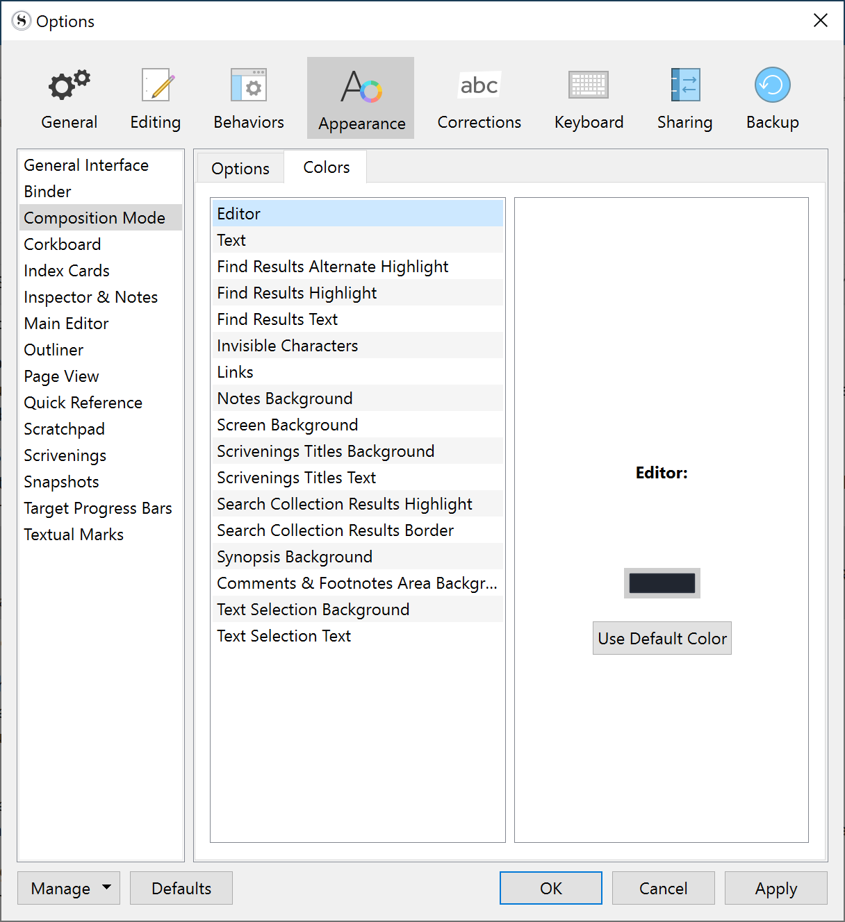 - Background Fade: Together with the Paper Position setting, you may want the background visible to view notes or research while still using the minimal display of Composition Mode. Use this slider to adjust how opaque the background is. If not, move the slider all the way to the right to mask everything other than your page.