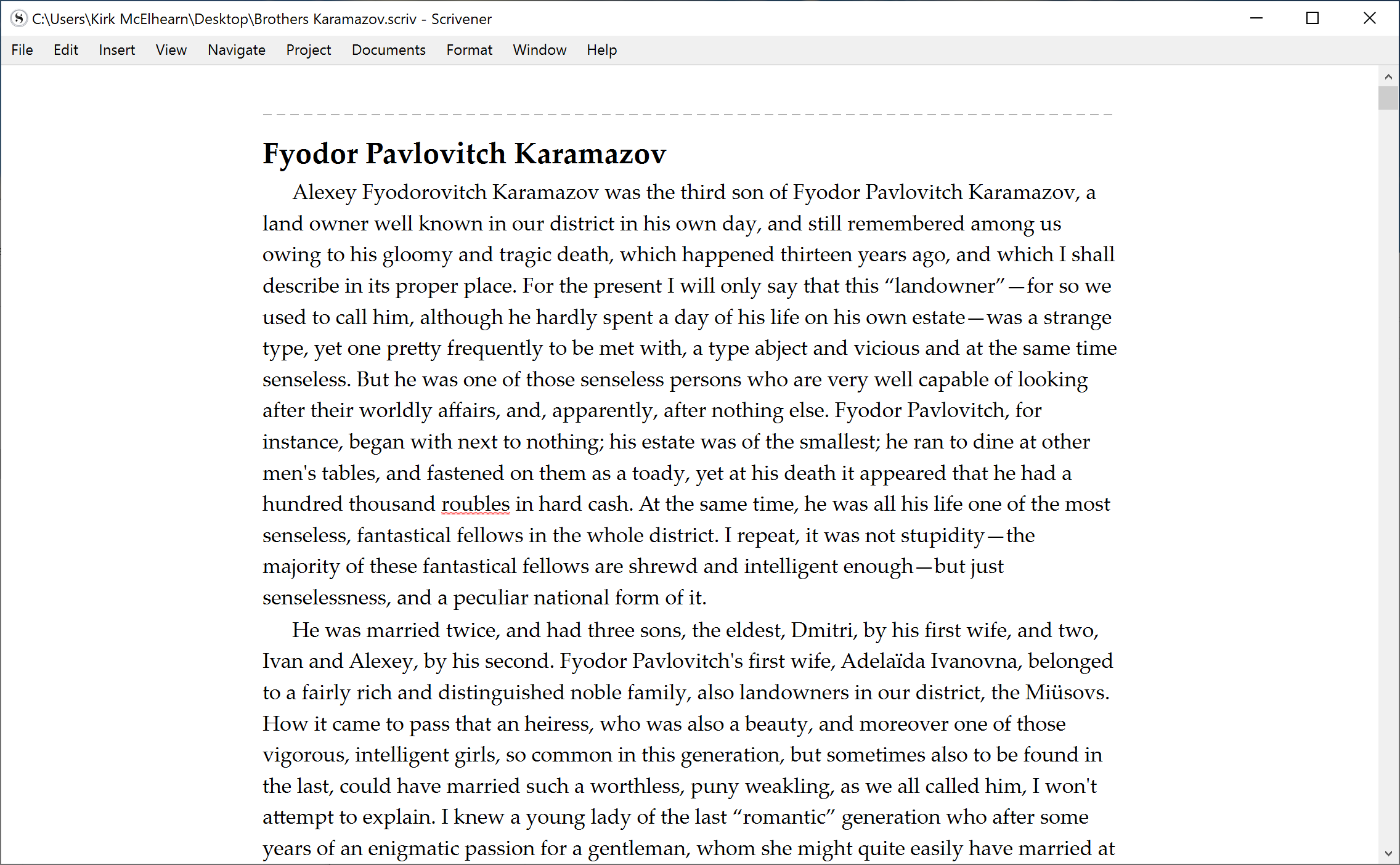 In Tame the Scrivener Window, I showed how you can remove the main elements of the Scrivener window when you don’t need them. All the key tools of Scrivener – the Binder, Inspector, Toolbar, and more – can be hidden by choosing a menu item or pressing a keyboard shortcut.