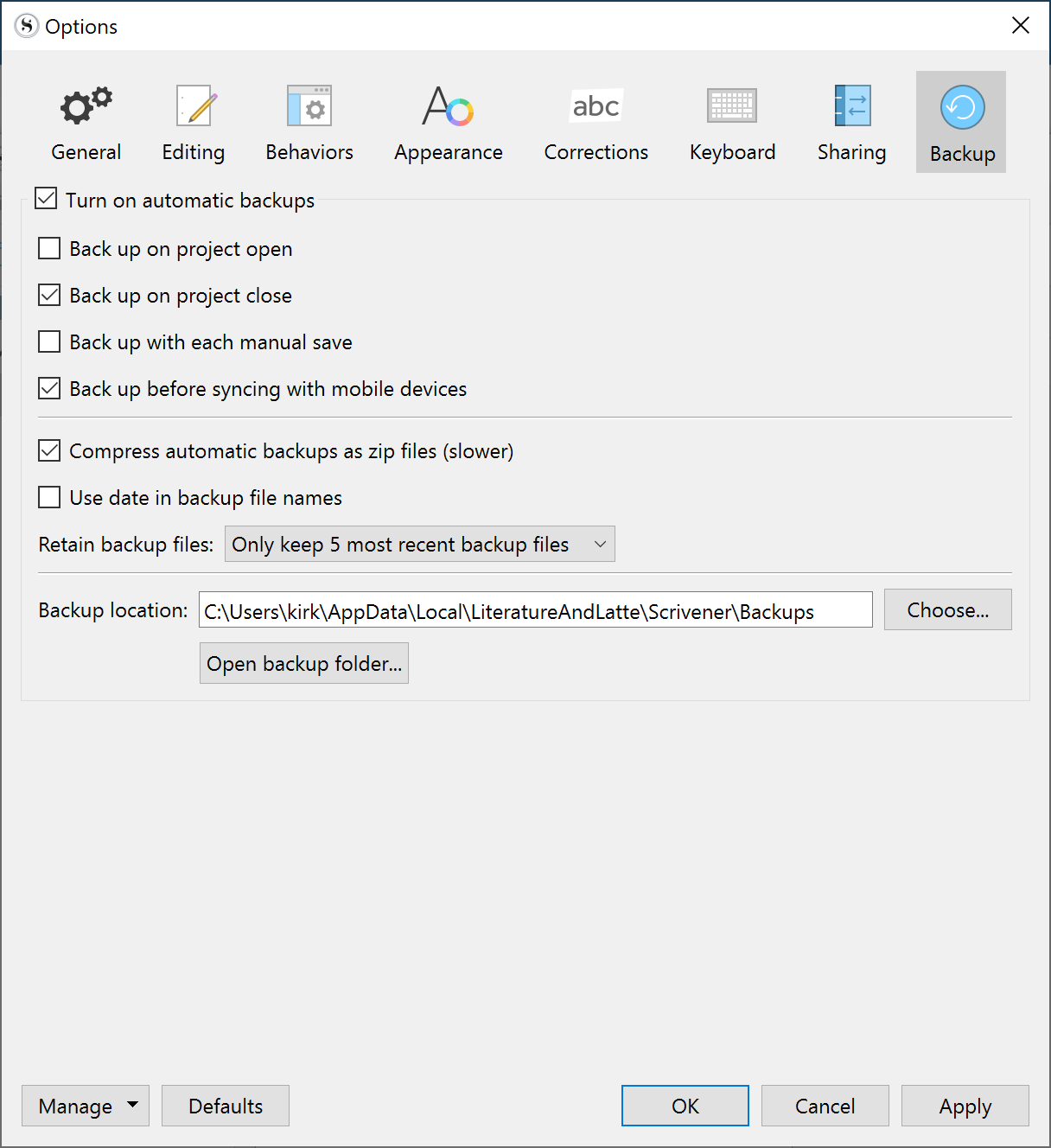 Scrivener is designed to protect your projects by backing them up automatically. The automatic backup setting is on by default, and Scrivener backs up to a specific folder on your computer. On the Mac, this folder is the /Library/Application Support/Scrivener/Backups inside your home folder (that’s the folder with your name and the house icon). On Windows, the folder is \AppData\Local\LiteratureAndLatte\Scrivener\Backups inside your user folder. You can see the backup folder in Scrivener’s settings: choose Scrivener > Preferences (Mac) or File > Options (Win). Click the Backup icon, and you’ll see this: