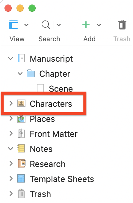 When you create a new fiction or scriptwriting project, the Binder contains folders for your work, research, and more, and it also contains a Characters folder for your character profiles.