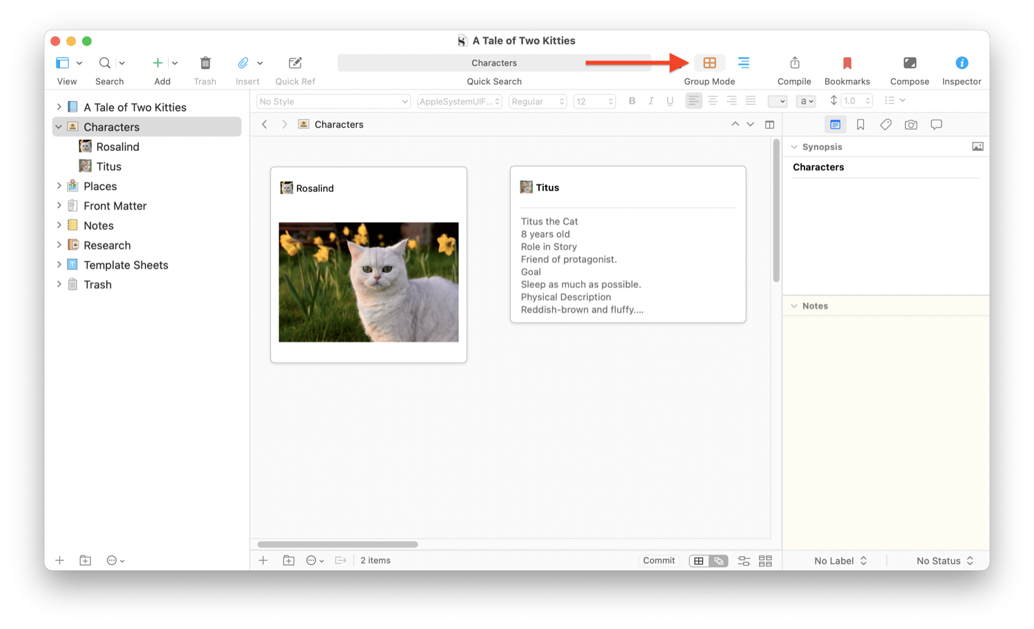 If you click the Characters folder, then click the Corkboard button in the toolbar (it’s the middle of the Group Mode button, indicated below), you can view all your characters in the Corkboard. Those with photos will display their photos; others will only display the beginning of the texts in their sketches.