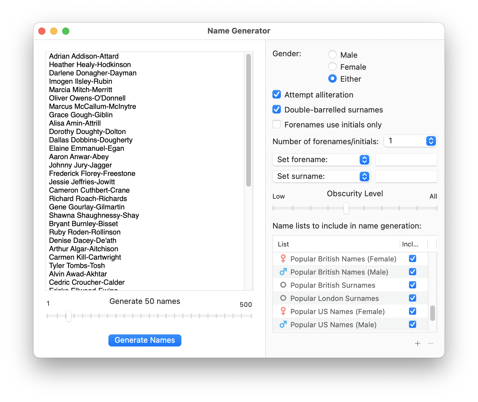• Obscurity level: you can drag this slider to change the range of names from, say, common names like Smith and Jones to more obscure names Winterbourne and Dunsford.