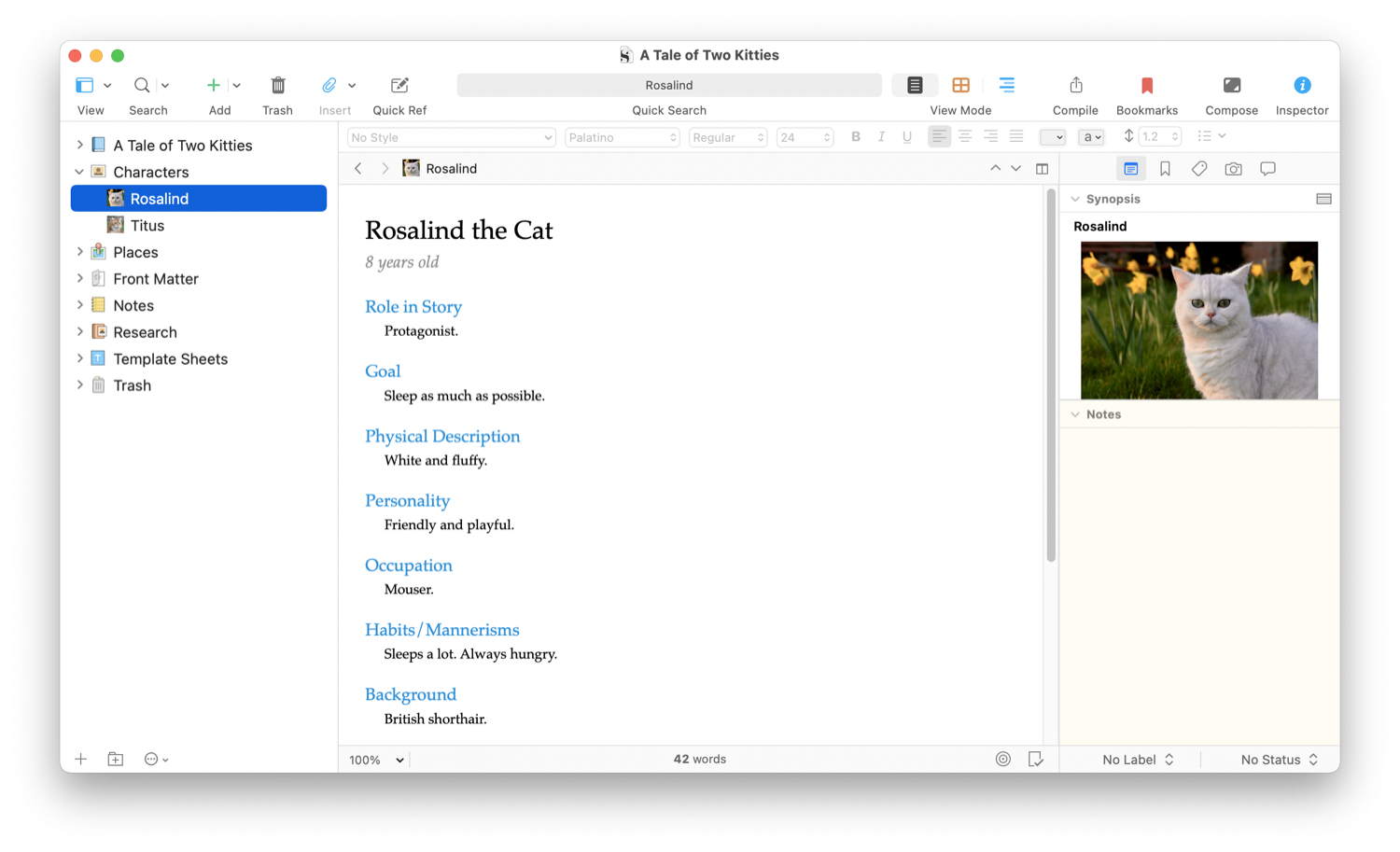 You can also record notes in the Inspector if you want to add more information than what’s in the character sketch, effectively creating a character sheet for writers.