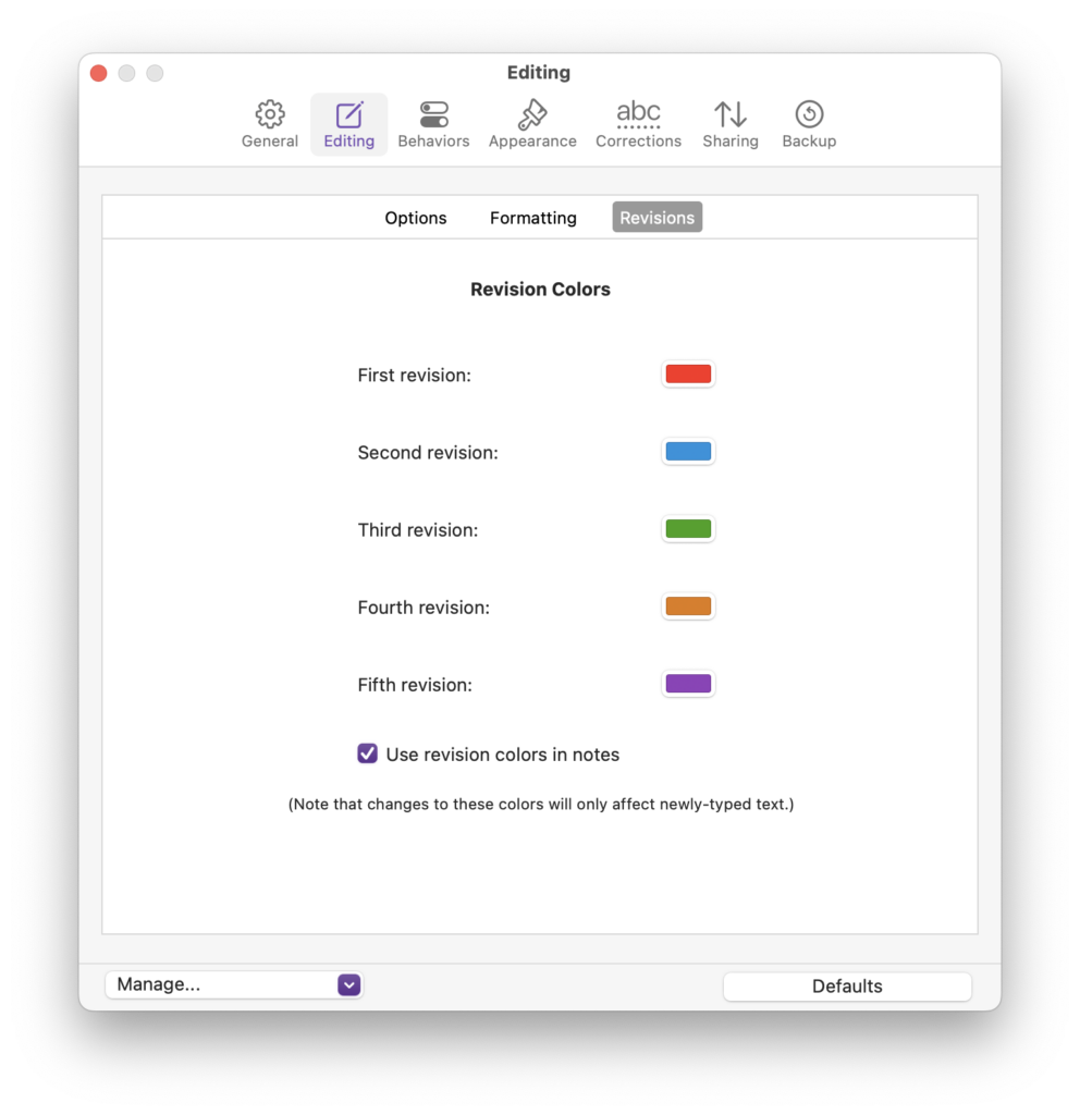 You can change these if you wish in Scrivener’s settings. Go to Scrivener > Settings (Mac) or File > Options (Windows), then click Editing in the sidebar, then the Revisions tab. Click any of the colors you wish to change and select a new color.