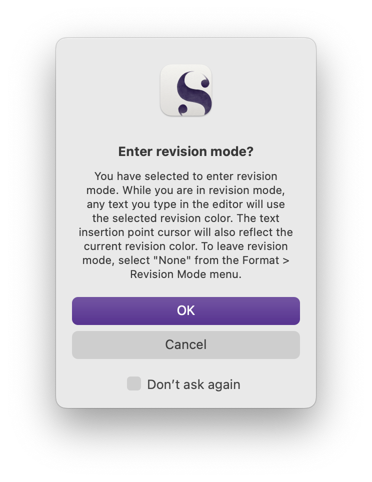 To turn on revision mode, choose Format > Revision Mode, then choose a revision level. You’ll see this dialog when you enable this feature.