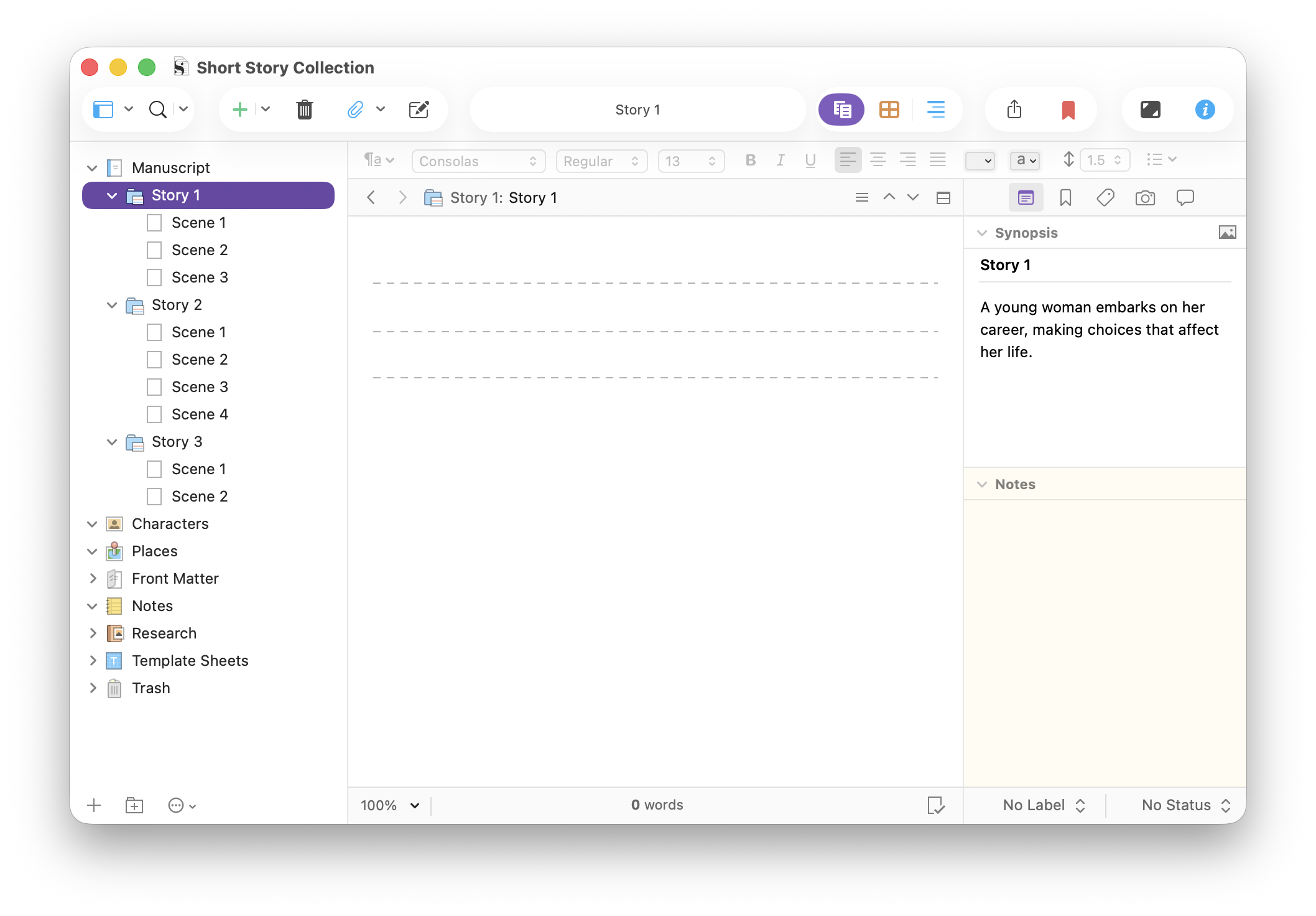 While there’s not much difference working with short stories or essays compared with, say, a novel or non-fiction book, some of Scrivener’s features, and its specific short story template, make the process a bit easier.