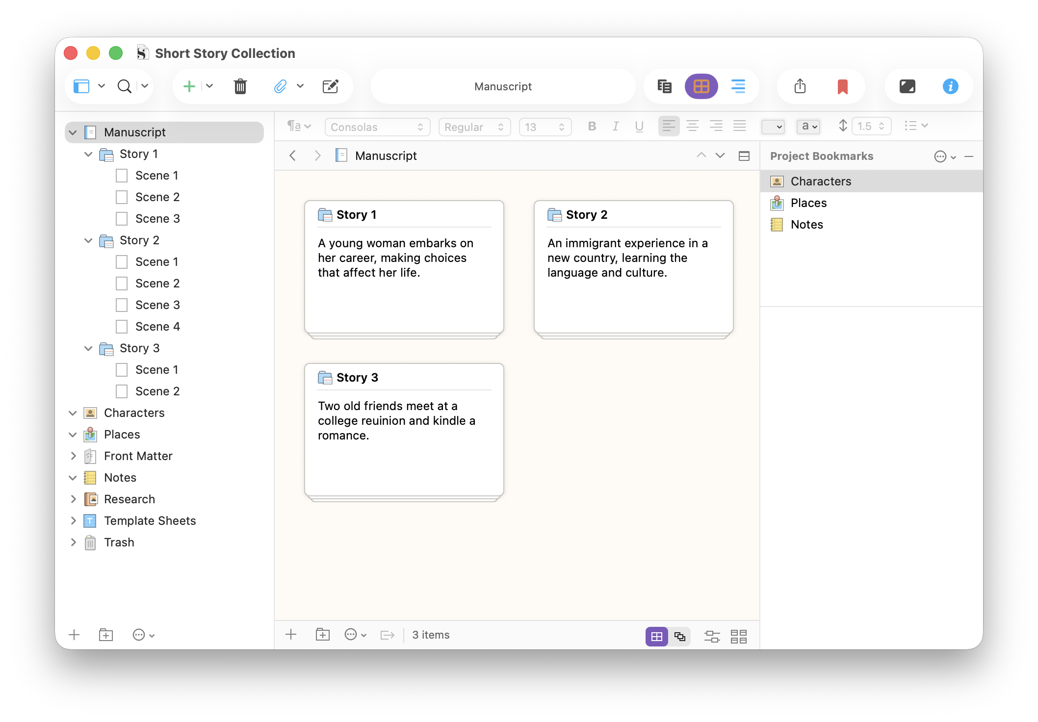 Use the Synopsis field in Scrivener’s Inspector to write a short description of each story or essay. This makes it easy to view the sequence of your collection in Scrivener’s Outliner and Corkboard. You can rearrange the order of your stories or essays by dragging them in either of these interfaces.