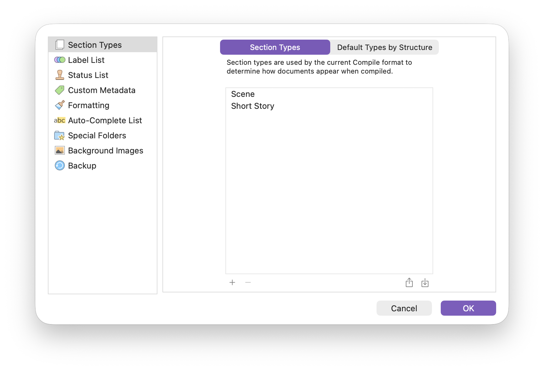 The Short Story template includes some compile settings specific to this type of project. To compile your collection, it helps to assign section types to your project. You can access this in Project > Project Settings: