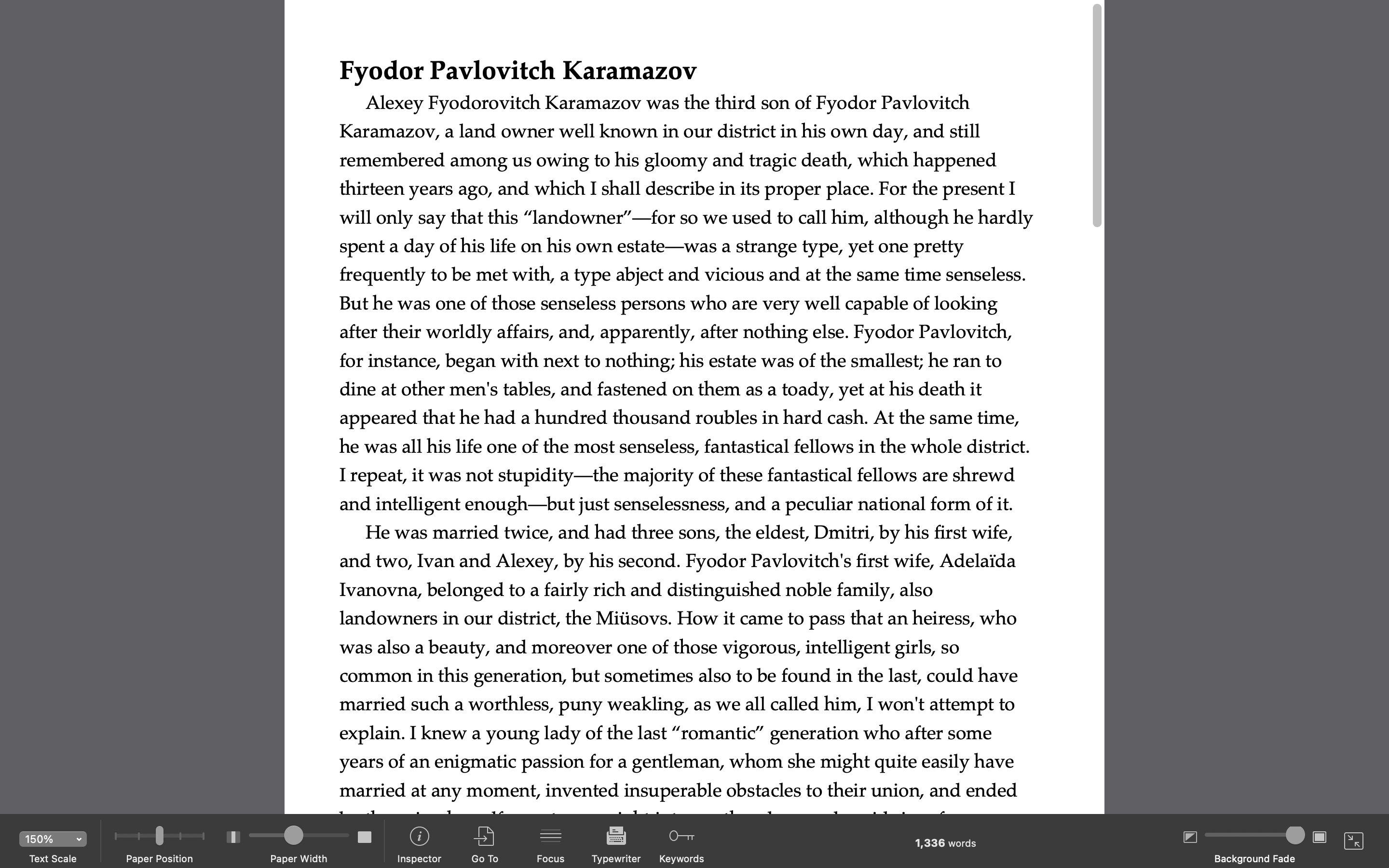Scrivener is a full-featured writing environment, but it also offers a minimalist mode allowing you to focus on your writing and not be distracted by the rest of the app’s features. Called Composition Mode, this shows only text on a page with a non-distracting background, so your entire focus can be on your writing. You can access many of Scrivener’s features by moving your cursor to the top or bottom of the screen, and switch back into the full Scrivener interface quickly if you want to.
