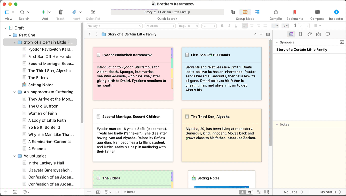 Scrivener gives you the tools to plan as you write, to revise the structure of a work as you progress, and to easily make changes as you go forward.