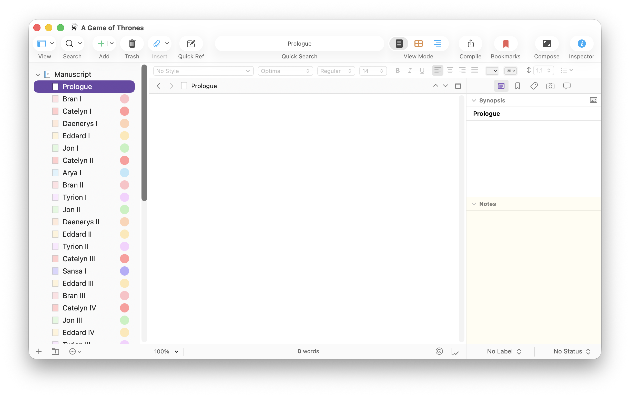 If you work with multiple point-of-view characters, it’s a good idea to mark their scenes or chapters with labels. I’ve made a sample Scrivener project with all the chapters of A Game of Thrones, named as they are in the novel: the point-of-view character’s name followed by the Roman numeral of their appearance in the story. I’ve set up labels for each character, and chosen to display them in the Binder and as Binder icons. These labels immediately show the complexity of this approach.