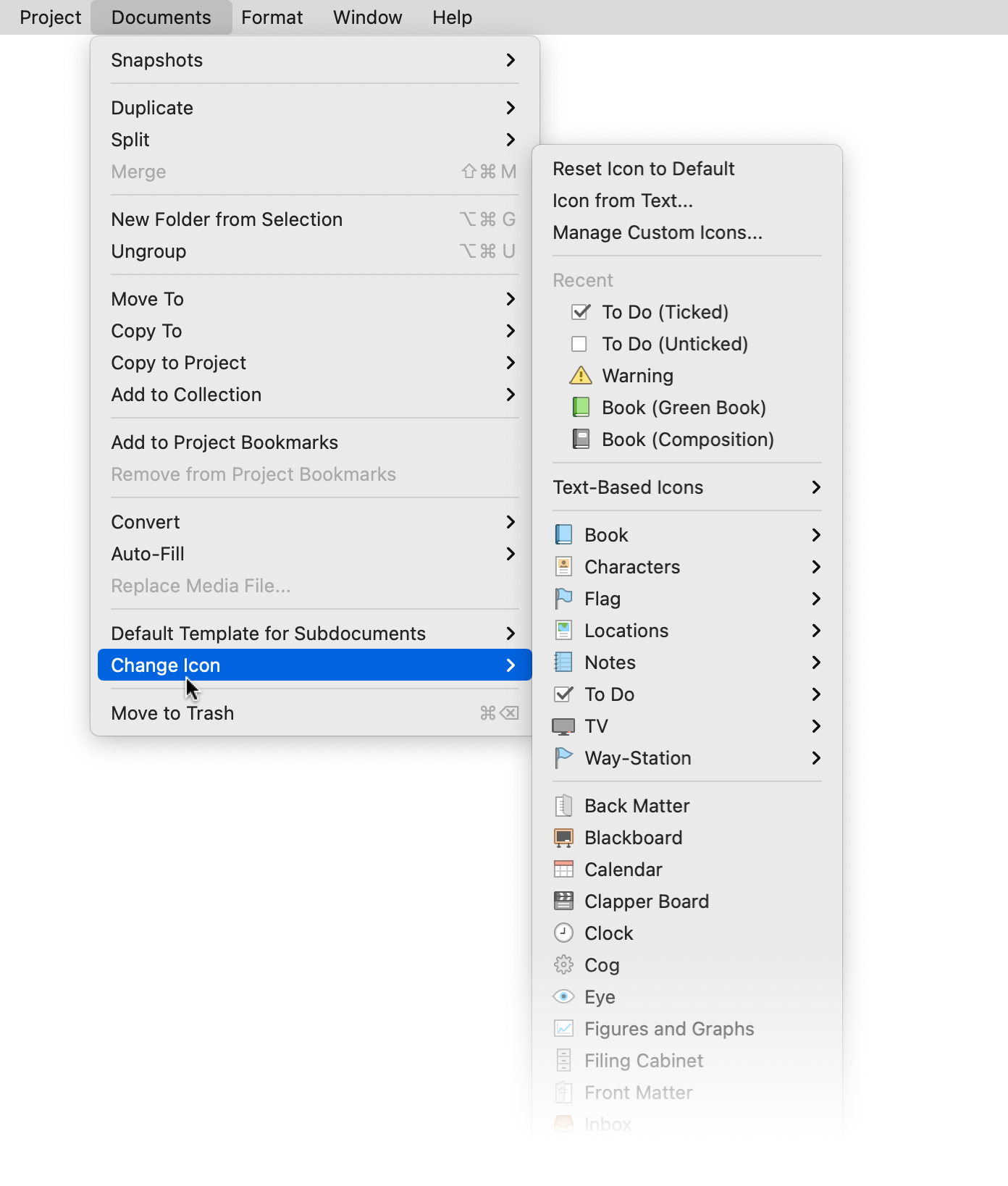 It’s easy to change Binder icons, and Scrivener includes dozens of them. To change an icon, select an item, then choose Documents > Change Icon, or right-click on an item and choose Change Icon; the Change Icon menu item is near the bottom of the menu that displays when you do either of these.