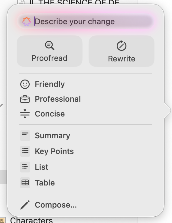 As the menu shows, you can use these tools to proofread or rewrite texts, summarize them, make a list of key points, and more. The Compose item at the bottom of the menu lets you ask ChatGPT to create new texts. Surely, you don’t want to do this in your manuscript…